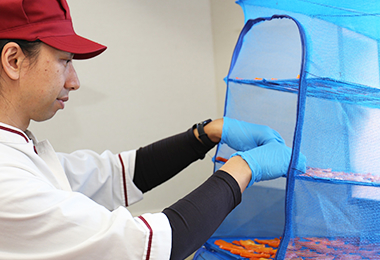 皮にある栄養素の多さ、健康的な食べ物であるという事実をより多くの方に知っていただきたいという想いもあり、洗浄から全て手洗い手作業での製造になります。丸ごとという特殊なものになりますので、均一した乾燥など機械作業でできない事も多く、手間暇かけて丁寧に作っております。