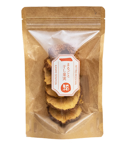 他社のドライフルーツは甘味料を追加する製法が多く見受けられますが、一福のドライアップルは丸ごとりんご1つをそのまま使用する独自の製法で加工しますので、果糖が濃縮されより甘い味わいを楽しめると共に、追加甘味料は一切ありません。